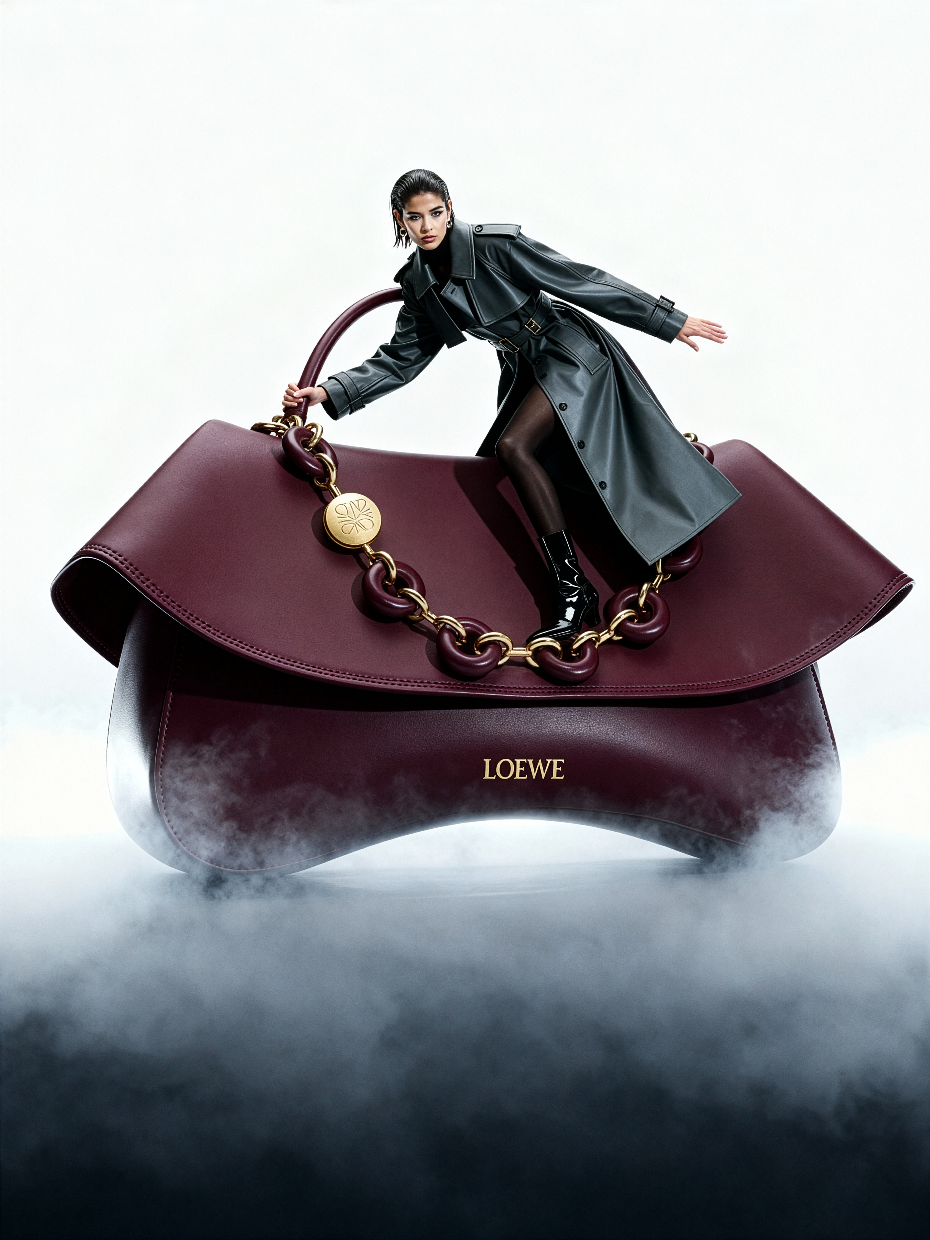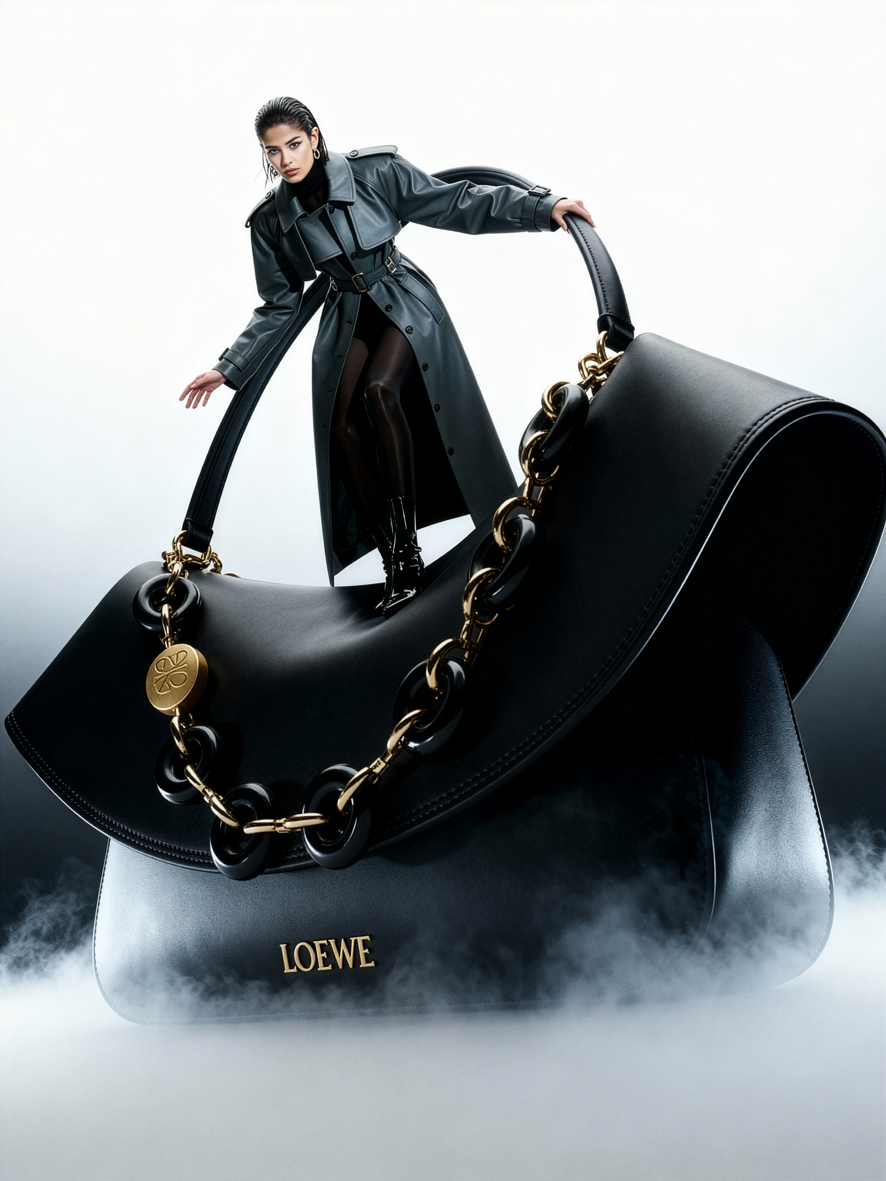 Cinematic full-body wide-angle fashion photograph, camera positioned low and slightly tilted upward. Same European woman as in the reference image — wet sleek hair, sculpted facial structure, intense gaze. Wearing the same matte structured trench coat (Yohji Yamamoto aesthetic), glossy black boots, standing in dense homogeneous milky fog that diffuses light smoothly. She interacts directly with a giant Loewe Ola Medium Shoulder Bag (same real design, proportions, color, and structure as the original model), scaled to several times her height. The bag’s curved architectural silhouette rises from the fog like a sculptural monument — smooth matte leather surface reflecting soft cinematic light. Pose: she climbs onto the base curve of the bag, one hand on its handle, other extended slightly for balance. Lighting: wide diffused glow, no hard shadows, volumetric fog scattering around. Background: seamless gradient fading from white above to deep smoky gray below. Mood: futuristic realism, calm tension between human and object, luxury surrealism. Keywords: Loewe Ola bag, real proportions preserved, wide-angle distortion, dense milky fog, gradient background, cinematic fashion realism, interaction, minimalist elegance.