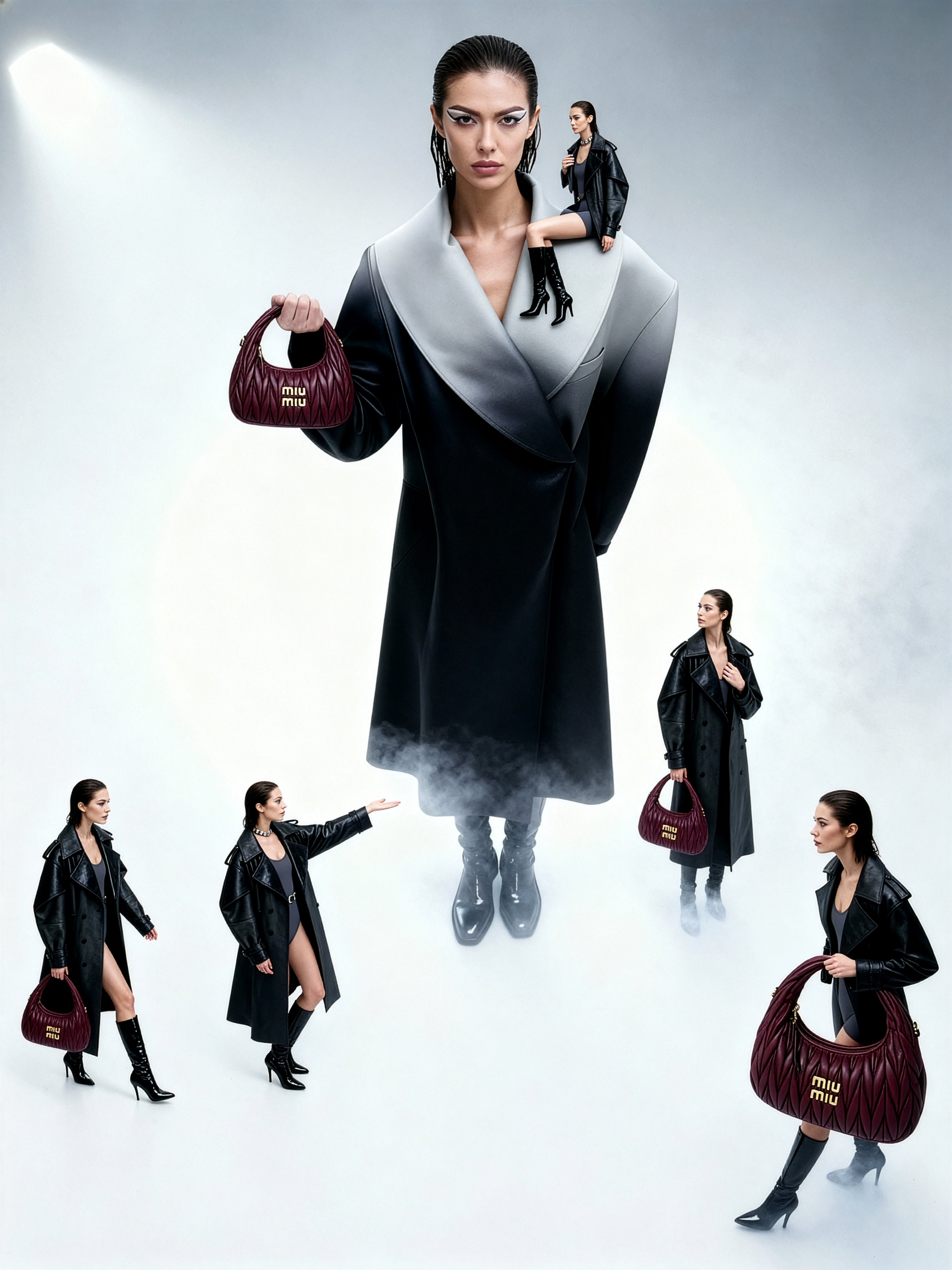 Cinematic surreal full-body fashion photograph, wide-angle perspective without vignette or circular fisheye. Smooth gradient background from bright white at the top fading into soft smoky gray at the bottom. Dense milky fog covers the floor and rises around the legs, glowing softly and merging with the background. A giant woman stands at the center—same as in the reference image, sleek wet hair combed back, confident calm face, glossy skin, wearing a long black leather trench coat with sculptural shoulders and subtle reflections, black bodysuit underneath, metallic choker necklace, and high patent leather boots. Lighting is cinematic and diffused, frontal with soft rim highlights accentuating the coat texture and silhouette. Around and on her are four miniature identical women, dressed in the same outfit, captured in dynamic natural poses—one stands on her shoulder slightly leaning forward, one sits casually on her collar fold looking upward, one balances on her forearm extending a hand outward, and one stands at her foot half-immersed in fog gazing upward. Each miniature figure holds a tiny Miu Miu Wander Matelassé Nappa Leather Hobo Bag in deep burgundy with realistic quilted nappa texture and small gold “Miu Miu” logo reflecting the light. All proportions of figures and objects preserved realistically, composition balanced and cinematic, atmosphere minimalistic and surreal with smooth soft shadows, high detail, and consistent scale.Keywords: dense white fog, gradient background, matte silicone fabric, full-length futuristic coat, brutal minimalism, cinematic lighting, low-angle perspective, elongated legs, photorealistic detail, atmospheric haze.