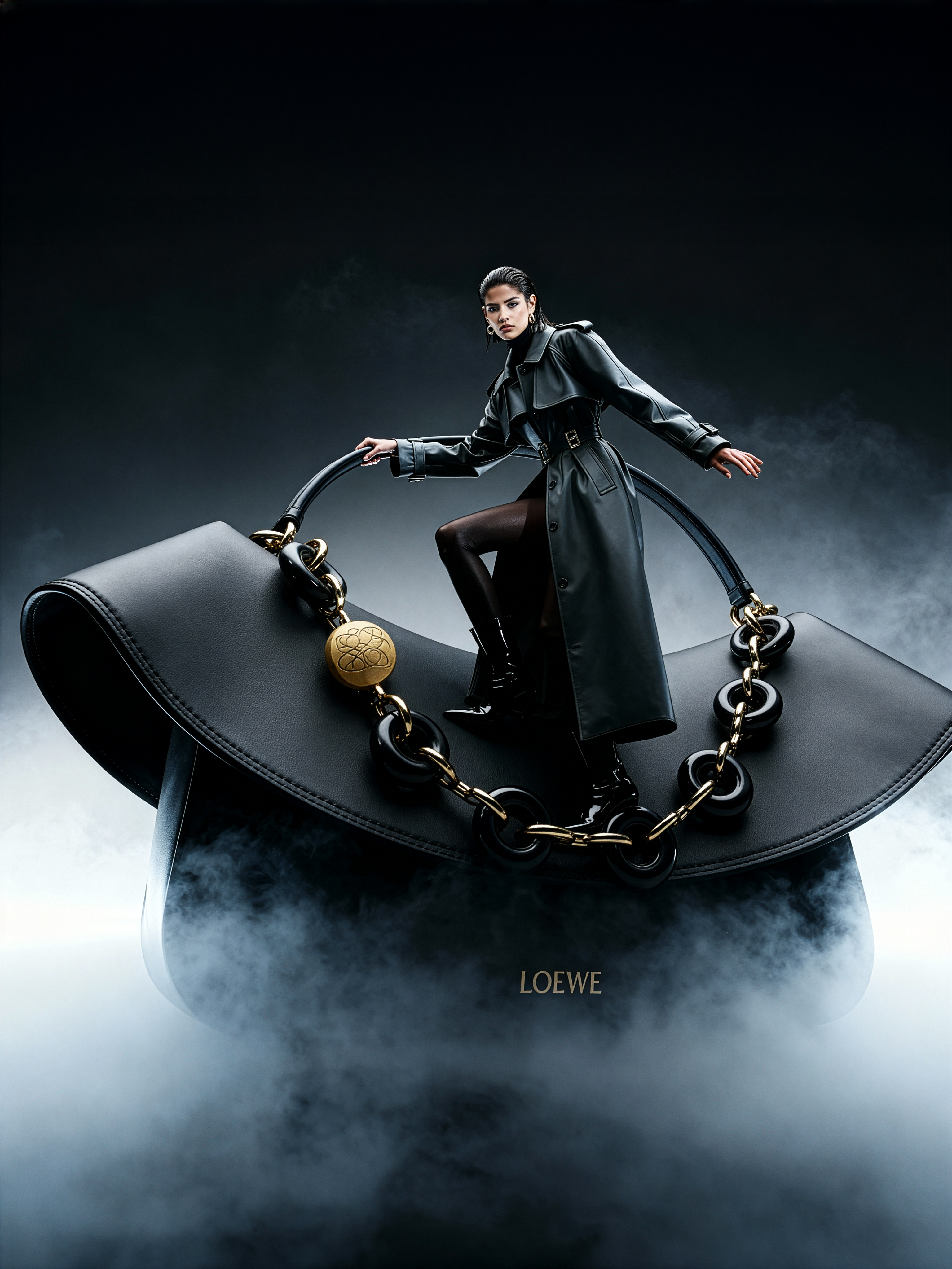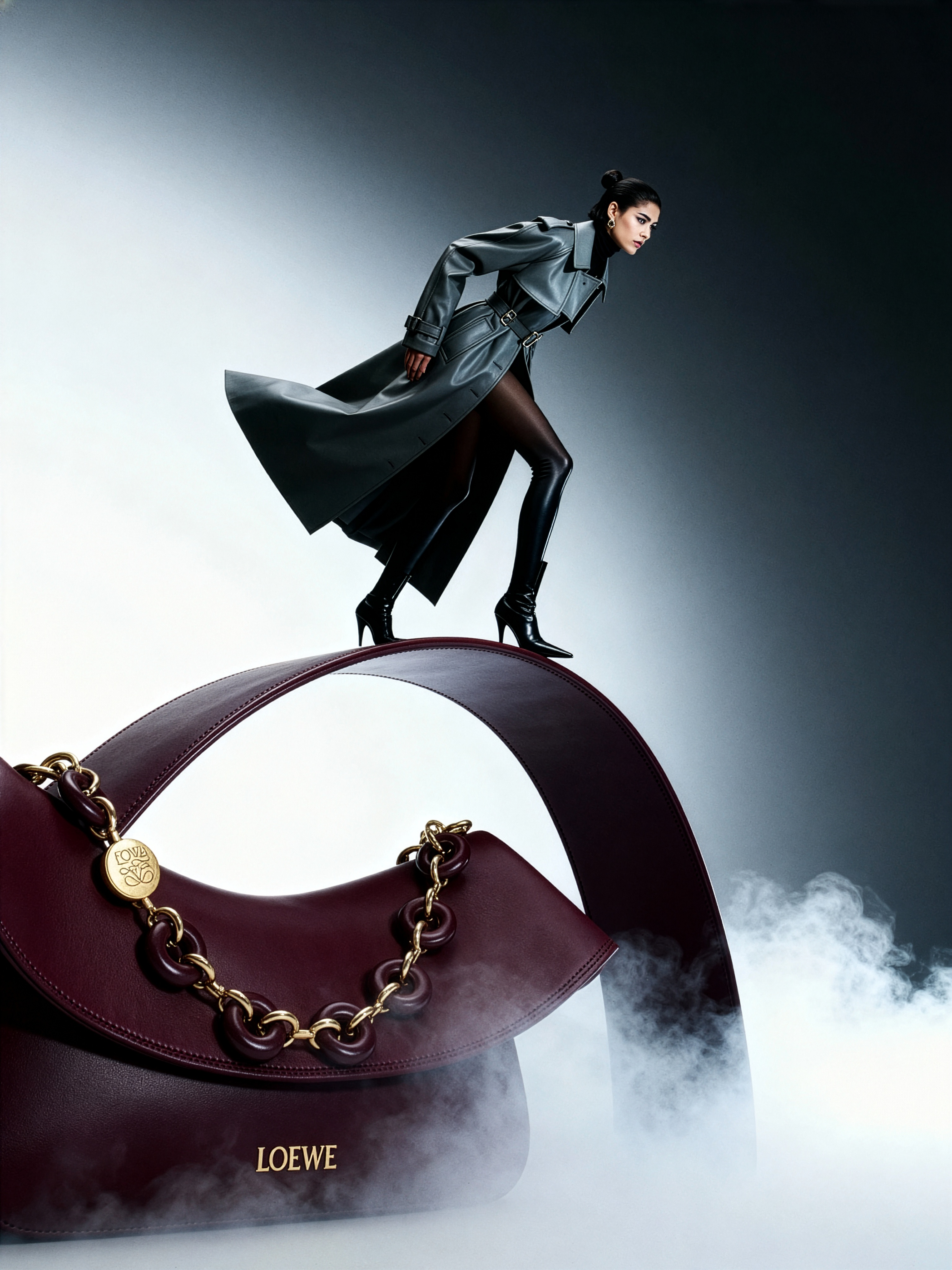 Model stands on the curved edge of a gigantic Loewe Ola bag, balancing as if on a narrow bridge. The bag arches through the frame like an abstract structure, its matte gray surface glowing softly through dense milky fog. Gradient background from white to charcoal gray. Lighting soft and cinematic, fog evenly diffused. Pose: one foot on the arch, body leaning slightly forward, coat flowing as if caught in slow motion. Mood: weightlessness and control, architectural grace. Keywords: wide-angle distortion, oversized fashion object, balance, dense fog, gradient minimalism, Yohji Yamamoto style.