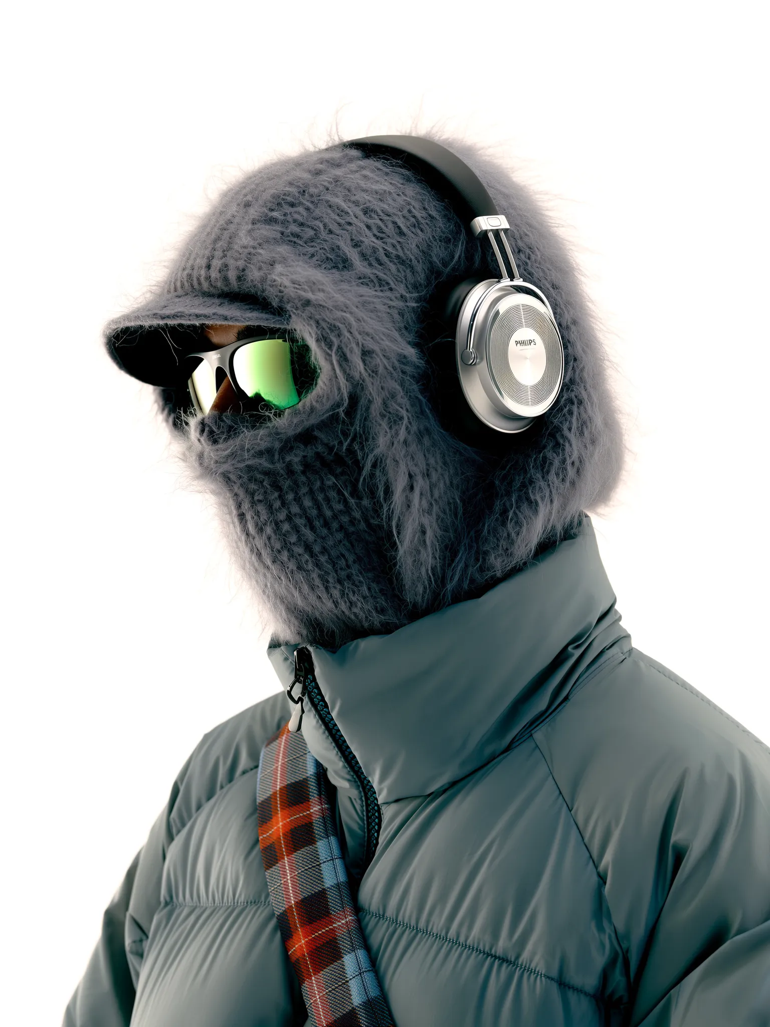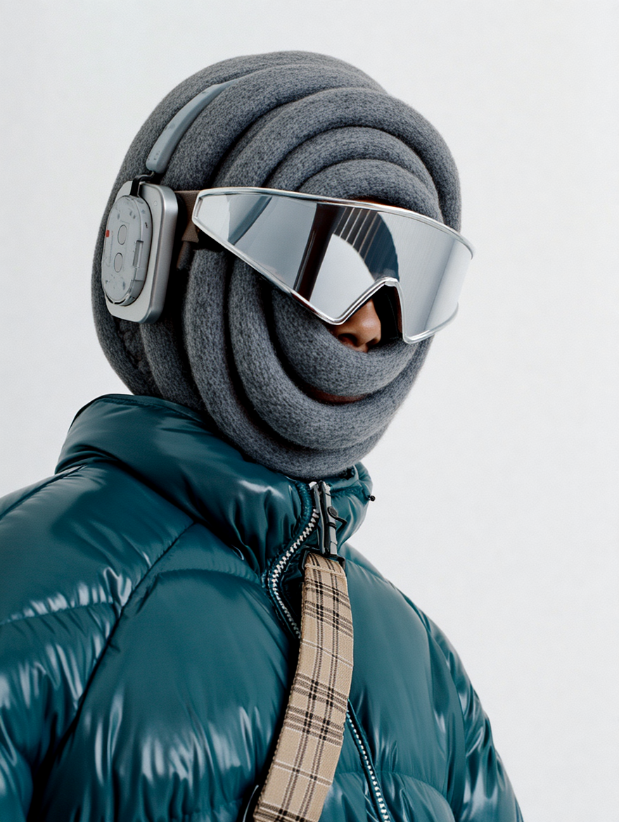 High-quality photograph of a fashion model wearing a thick, sculptural wool balaclava in soft heather gray, forming smooth circular layers around the face. The model wears futuristic mirrored ski goggles and large retro silver Philips over-ear headphones. Outerwear: glossy teal puffer jacket with a beige plaid shoulder strap. Shot on a pure white background, evenly lit with soft studio lighting, creating clean, minimal contrast and a high-fashion editorial feel. Captured in a medium close-up framing from the chest up, slightly angled to the side.