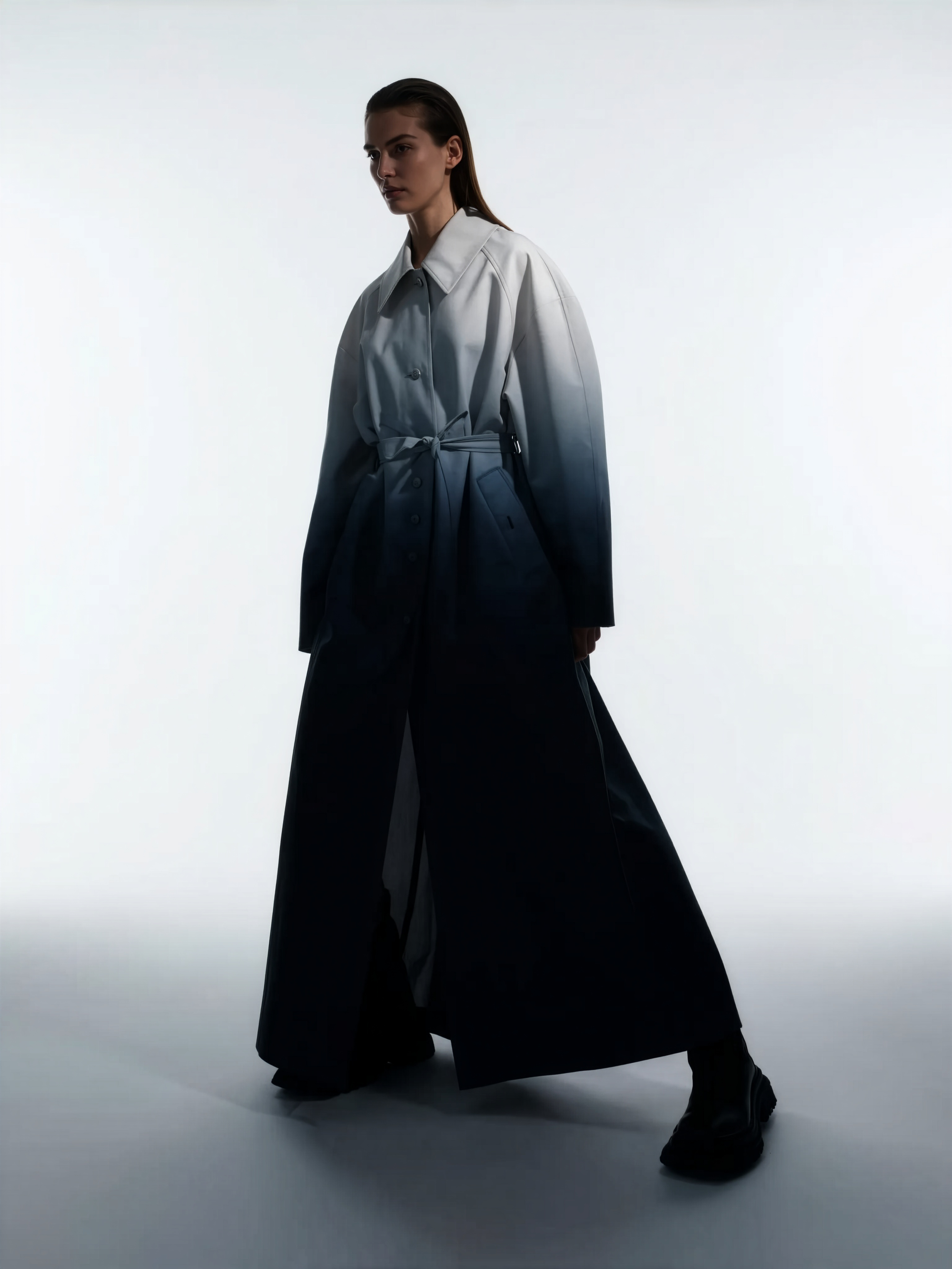 High-quality cinematic fashion photograph captured with a wide-angle lens (16–20 mm) from a low perspective, camera positioned near floor and tilted slightly upward for dynamic perspective and elongated legs. Composition: full-body vertical framing. Scene: minimalist gradient background fading from bright white at the top to smoky soft gray at the bottom. The floor is covered in dense milky fog, smooth and even, spreading like liquid light — thick enough to veil the floor softly, yet translucent so the model’s silhouette remains crisp and visible. The fog diffuses light in every direction, creating soft volumetric atmosphere without obscuring the subject. Lighting: cinematic diffuse lighting — broad soft key light from front-left, low contrast and even tone, with subtle rim glow from behind to trace the coat edges. No harsh spotlights or visible hotspots. The illumination feels enveloping and poetic, revealing texture and contour rather than blinding brightness. Model: beautiful European woman with intelligent features, luminous skin, soft neutral tones, wet sleek hair combed back. Expression calm, enigmatic. Outfit: full-length Yohji Yamamoto–inspired trench coat — sculptural oversized silhouette with asymmetric folds and elongated panels; structured collar, belted waist. Material: dense matte fabric with soft silicone gradient coating — semi-translucent near shoulders fading into deep black at the hem. The coat extends fully to the floor, heavy yet fluid. Beneath, minimal seamless layers — no visible bodysuit or bare legs. Footwear: matte pointed boots hidden partly by coat folds. Pose: dynamic — one step forward, weight shift onto front foot, coat subtly opening with motion; shoulders turned slightly, arms relaxed. Camera distortion elongates proportions, creating subtle movement tension. Mood: mysterious calm, restrained power. Keywords: cinematic wide-angle fashion shot, Yohji Yamamoto aesthetic, dense milky fog, gradient background, poetic lighting, soft diffusion, brutal minimalism, elongated silhouette, atmospheric depth, realistic textures.