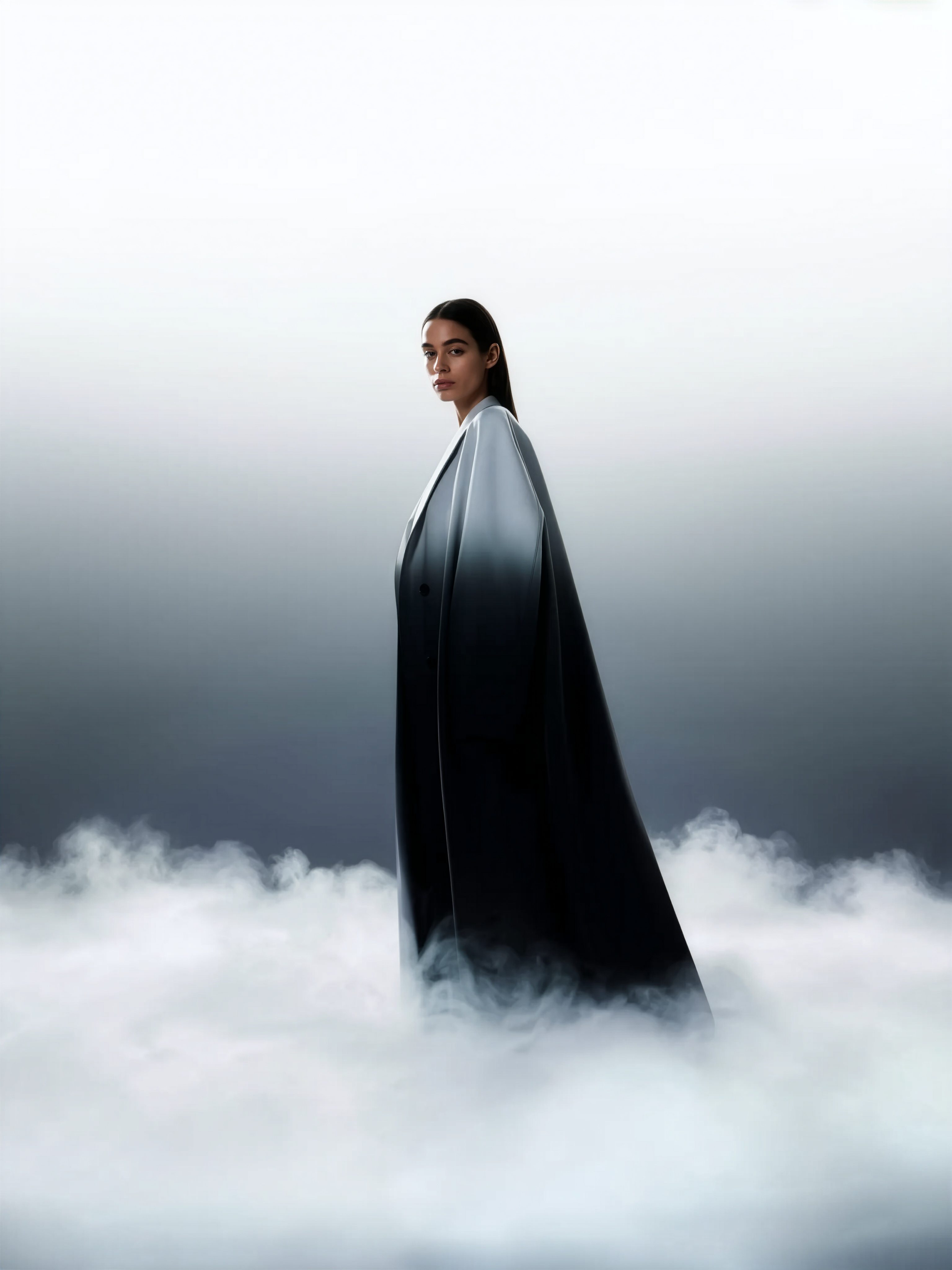 High-quality cinematic fashion photo, full-body, wide-angle low perspective. European woman with refined natural beauty and luminous skin stands inside dense milky fog — thick smooth white layer covering the floor and gently wrapping around her legs. Background with clear vertical gradient fading from bright white above to soft smoky gray below. Lighting soft, diffuse, even — no harsh shadows or spotlights, subtle volumetric glow through fog. Outfit: long flowing Yohji Yamamoto–style coat without belt, oversized and sculptural, reaching the floor. Matte heavy fabric with smooth silicone gradient finish — light gray at shoulders fading into deep black at hem. Coat moves slightly with air. Mood: mysterious minimalism, cinematic calm, futuristic elegance. Keywords: European model, dense milky fog, gradient background, full-length coat, wide-angle lens, atmospheric depth, soft cinematic light.