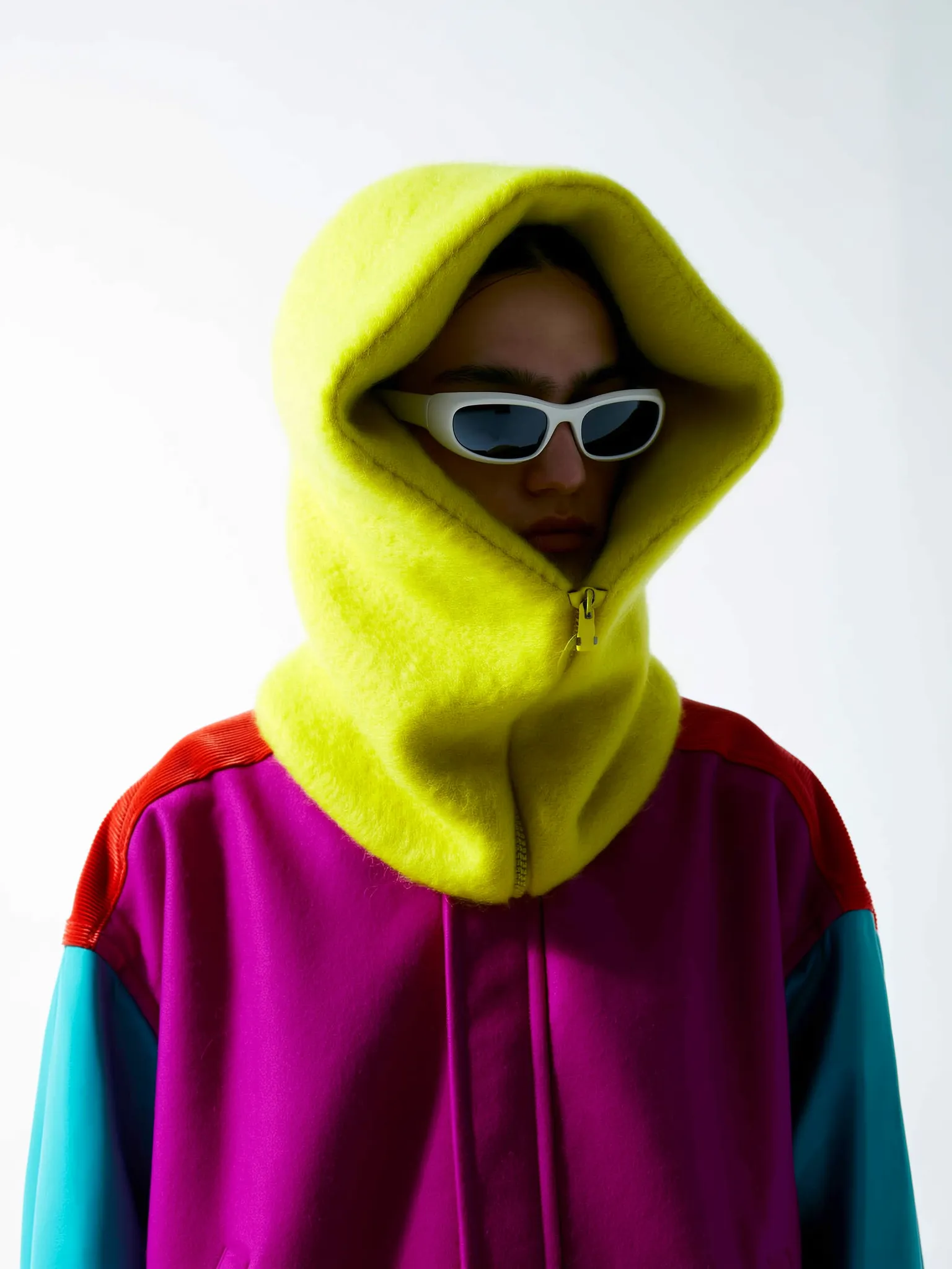 High-quality photograph of a fashion model in a bright chartreuse yellow wool balaclava, thick and cocoon-shaped, covering the lower face and forming sculptural folds around the head. The model wears white retro ski sunglasses and a color-block vintage winter jacket in magenta, turquoise, and red corduroy. Shot on a clean white background under soft diffused light, creating a cozy yet futuristic aesthetic with tactile wool texture visible. Medium close-up composition with natural shadows and subtle color harmony.