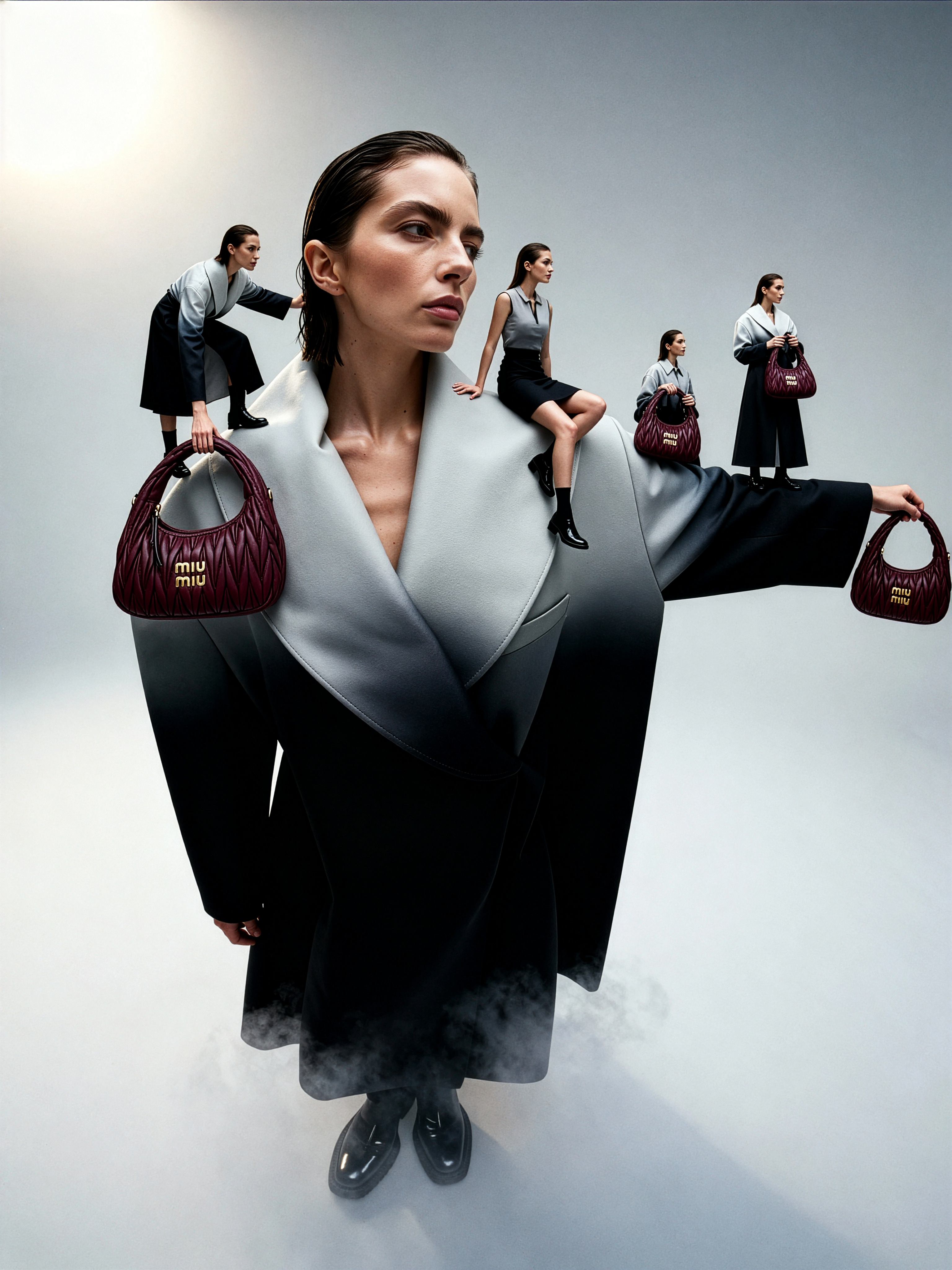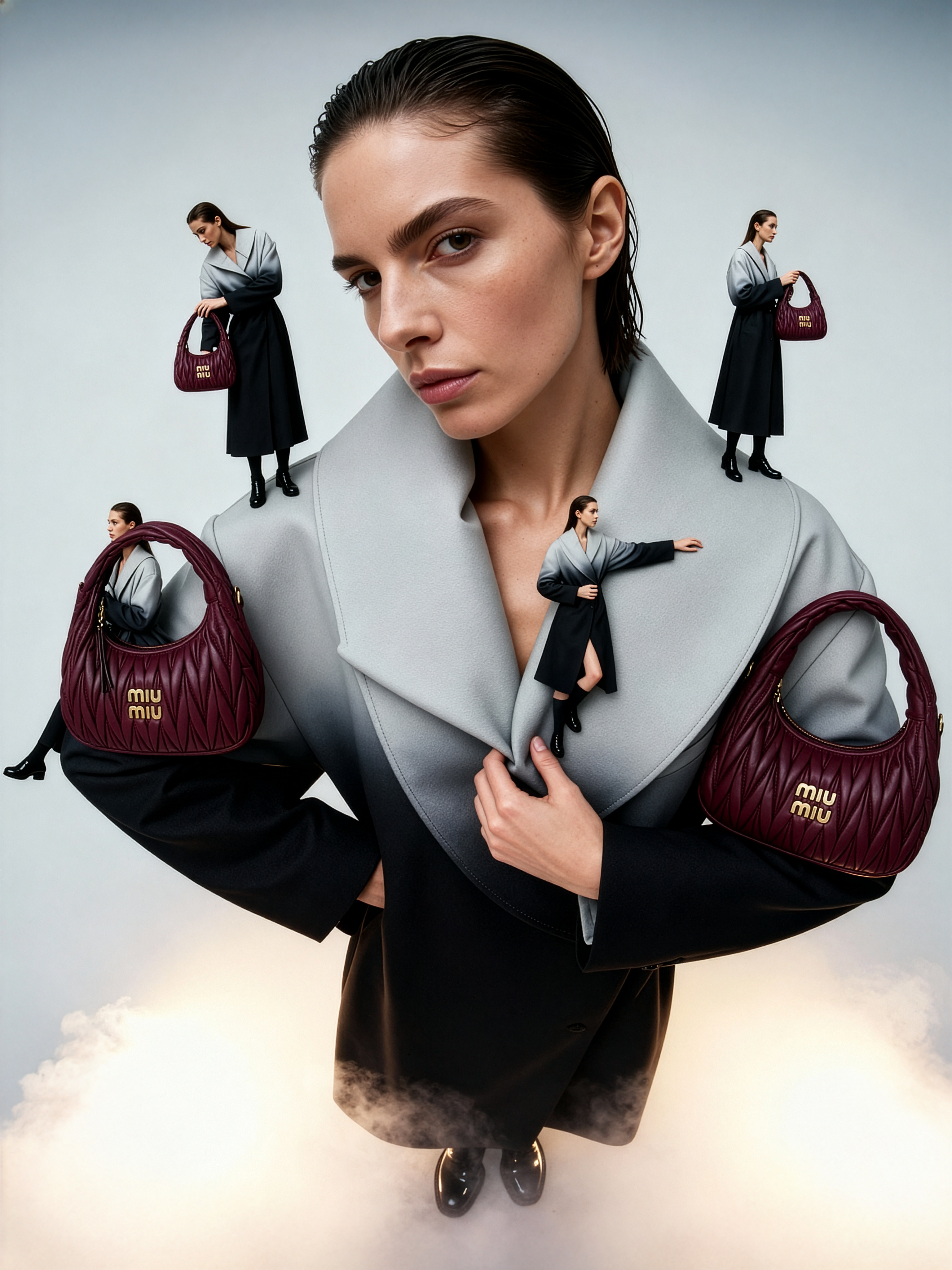 Cinematic surreal fashion composition, wide-angle leCinematic surreal fashion composition, wide-angle perspective without vignette or circular ns (fisheye-style without vignette), minimalist seamless gradient background fading from soft white to neutral gray. At the center stands a giant woman — same face, hairstyle, and clothing as in the reference (short sleek wet hair, sharp bone structure, calm expression, sculptural two-tone gray-to-black gradient coat with oversized folded collar, glossy black shoes). The lighting is cinematic and soft, illuminating her from above-left, fog lightly diffused near her feet. On the giant woman are four miniature identical women (from the second reference): one stands dynamically on her shoulder, leaning slightly forward with one hand balancing on the collar edge; another sits casually on her extended arm, looking sideways; the third climbs up along her collar fold, frozen in mid-motion; the fourth stands near her chest or neckline, steadying herself by holding the collar. Each miniature holds in her hands a Miu Miu Wander Matelassé Nappa Leather Hobo Bag in rich burgundy tone, scaled realistically to her proportions — smooth soft texture, visible gold “Miu Miu” logo, natural light reflections across the leather folds. The four bags contrast subtly against the monochrome gradient of the clothing and background. Lighting: soft frontal key light with volumetric diffusion, mild rim glow outlining each figure. Fog: gentle milky layer around the base for atmospheric depth. Mood: surreal scale play, elegant interaction between identities, monumental yet intimate. Keywords: Miu Miu Wander Hobo bag, burgundy leather, giant woman, miniature figures, gradient minimalism, cinematic wide-angle, surreal editorial, fashion architecture.