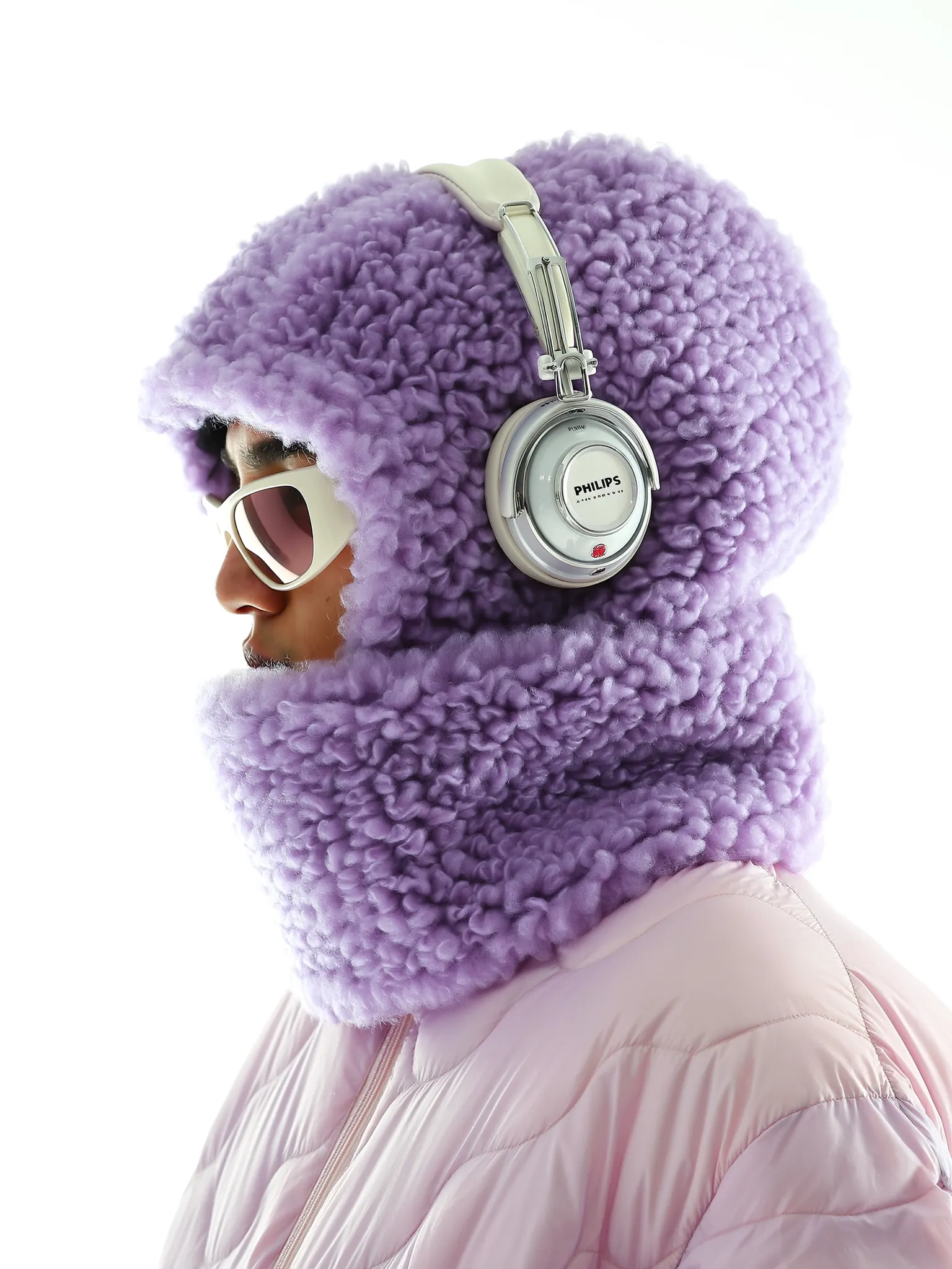 A fashionable side profile portrait of a person wearing an oversized lilac-colored wool balaclava hood and neck warmer with thick, tactile fleece texture and visible wool fibers. The face is visible above the raised neck cover, shielded by white-framed sunglasses with light pink lenses. Large retro silver Philips headphones with mechanical dials rest over the hood, enhancing a vintage tech vibe. The outer jacket is a light pink quilted puffer with subtle fading and textural contrast against the fleece hood. Shot from a slight angle with soft bright studio lighting on a white background, emphasizing layered softness, tactile fabric detail, and nostalgic yet contemporary winter outdoor fashion