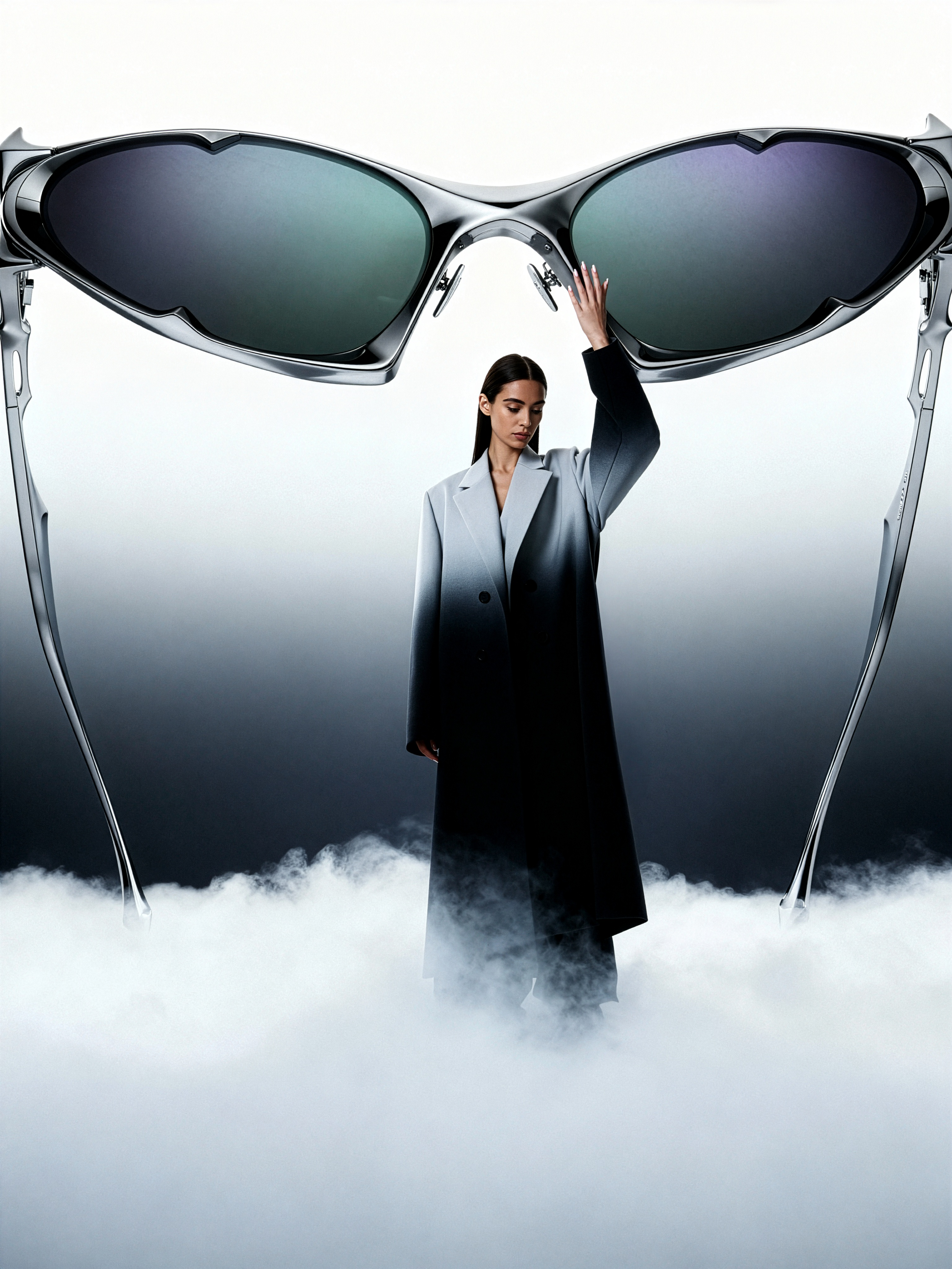 Cinematic full-body fashion photograph, wide-angle lens (16–20 mm), camera low to the ground and slightly tilted upward for elongated perspective. European woman with calm expression sits elegantly on top of a pair of gigantic Gentle Monster sunglasses, their metallic frame and reflective lenses spanning across the scene like a surreal monument. Dense milky fog covers the floor below, smooth and uniform, glowing softly from diffused light. Background: seamless vertical gradient fading from bright white above to soft smoky gray at the bottom. Lighting: wide soft cinematic diffusion, no harsh shadows, gentle rim glow tracing her silhouette and the edges of the glasses. Model: refined natural features, wet sleek hair pulled back, minimal luminous makeup. Pose: relaxed and balanced, one leg bent slightly, hands resting lightly on the frame — poised yet effortless, as if part of the structure. Outfit: long Yohji Yamamoto–style matte coat draped open, heavy architectural folds cascading downward; subtle gradient fabric (light gray to black). Mood: cinematic surrealism — human scale merged with giant design object, quiet futuristic elegance. Keywords: Gentle Monster sunglasses, oversized accessory, dense milky fog, gradient studio, wide-angle distortion, cinematic minimalism, surreal composition, sculptural balance.