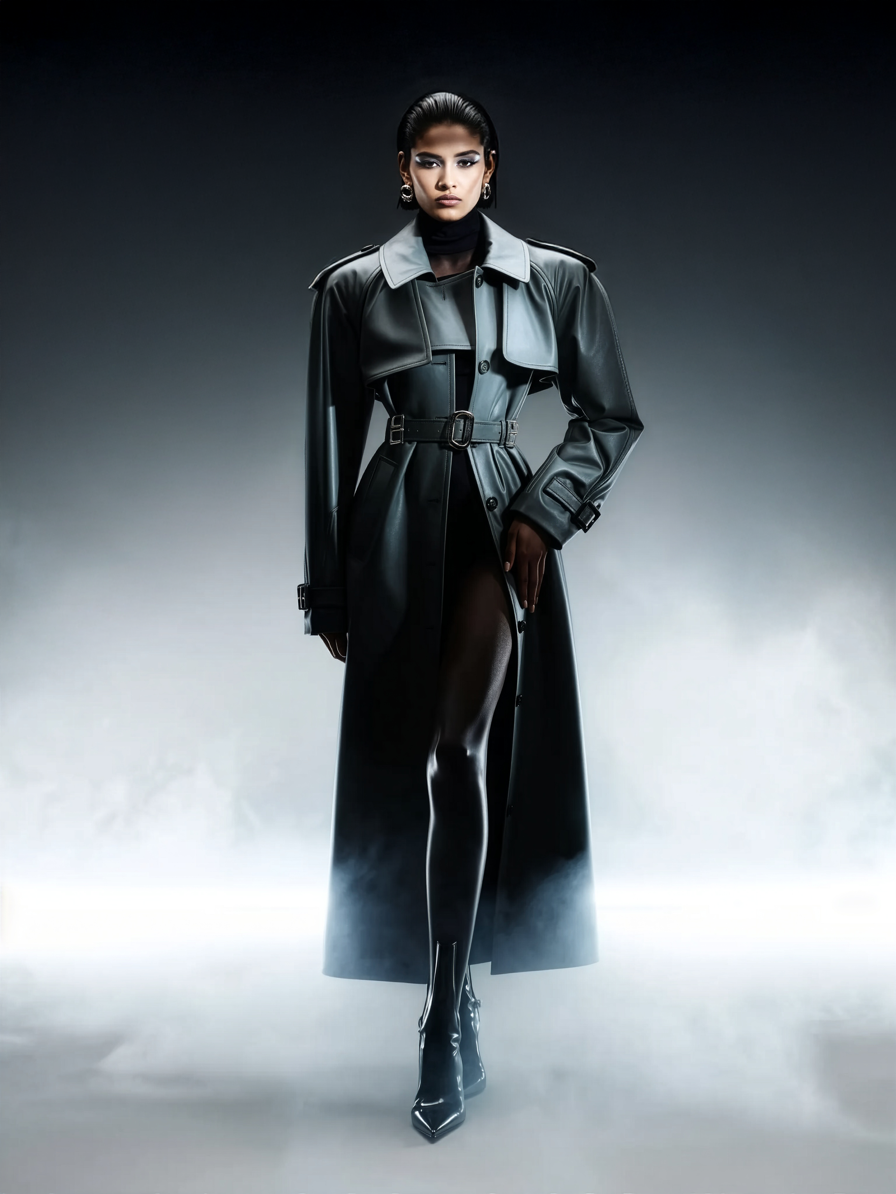 High-quality fashion editorial portrait, minimalist gradient studio setup fading from pure white to deep charcoal black, soft mist and subtle haze in the air creating cinematic depth and glow. Lighting: bright frontal key light with smooth diffusion — crisp high-key contrast on face and body, glossy specular highlights on skin and fabric. Subtle rim light from behind adds halo reflections through haze. Atmosphere: polished yet mysterious, with a foggy gradient backdrop blending smoothly into the floor. Model: standing confidently at center, upper body slightly turned toward camera, one foot placed slightly forward — balanced, powerful stance. Expression: calm, self-assured, eyes fixed ahead. Camera: full-body vertical framing, straight-on angle at eye level. Outfit: futuristic trench coat with structured silhouette and metallic or latex-like finish — tones of black, graphite, or deep gunmetal; minimal cyber accessories (belt buckles, small chrome accents, tech jewelry). Underneath: sleek fitted top or bodysuit blending with the coat; high glossy boots or sharp pointed heels. Hair: wet-effect texture, slicked back with subtle shine. Makeup: luminous skin, sculpted cheekbones, bold liner emphasizing eyes, glossy lips. Mood: brutal minimalism meets cyber-femininity — cinematic power aesthetic with controlled elegance and realism. Keywords: fashion editorial, cinematic lighting, fog haze, gradient background, glossy reflections, futuristic fashion, cyber minimalism, confident pose, realistic textures, soft contrast, misty depth, studio precision.