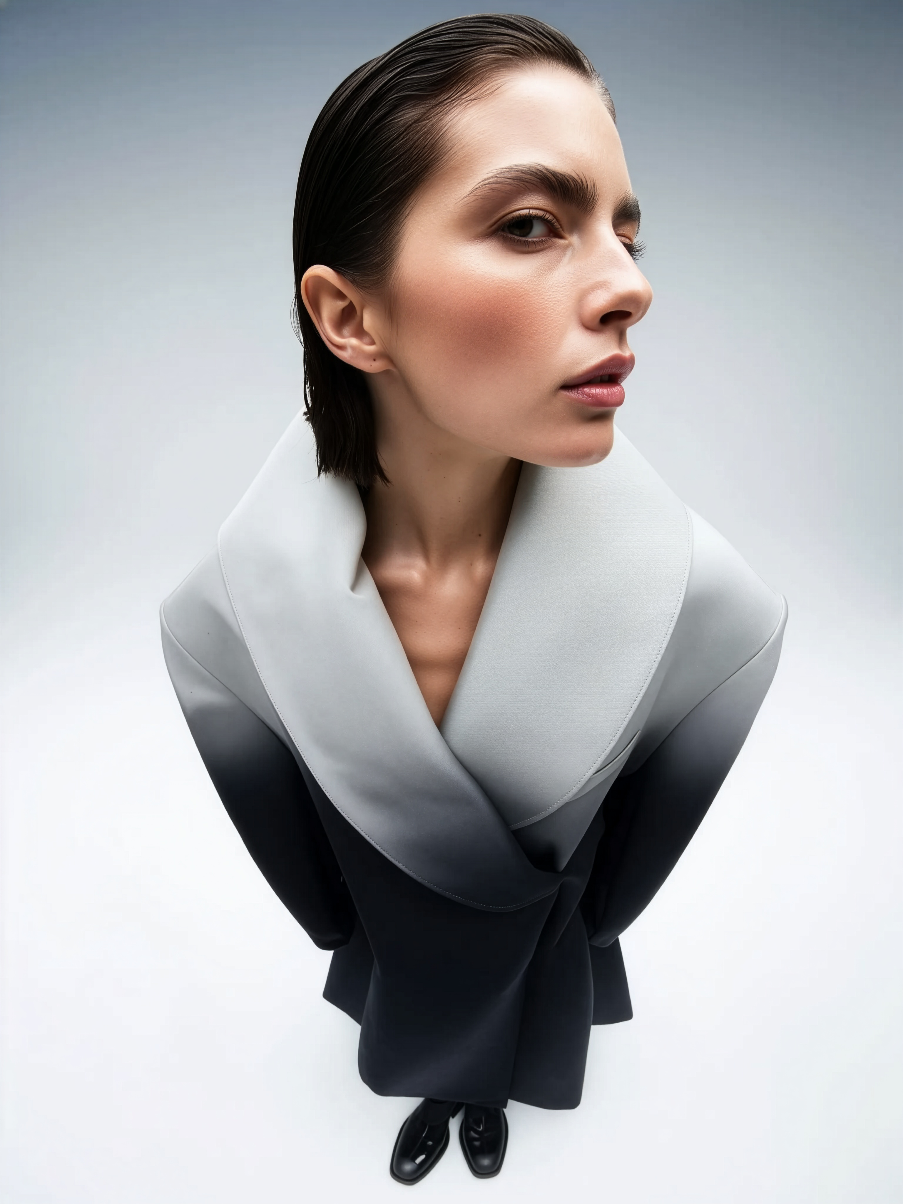 A wide shot of an elegant European woman with luminous fair skin, natural skin texture detailed across her forehead, cheeks, and jawline, and wet sleek hair pulled back tightly, captured in a middle close-up from a top-down wide-angle fisheye perspective. She wears an oversized, floor-length, pale gray to deep black gradient matte coat in the style of Yohji Yamamoto, draping voluminously with visible folds and creases. Her calm, confident expression gazes slightly off-center above glossy matte black footwear, her face projecting closely toward the lens with the distortion enlarging her forehead and elongated nose. She stands against a subtle gradient backdrop fading from soft white to smoky gray, enveloped in a smooth milky fog that diffuses broad even cinematic light, creating soft halos and atmospheric depth. The wide-angle lens pushes her coat volume and silhouette forward while curving the fog and background inward, with visible fabric texture, skin pore detail, and minimal grain overlay maintaining editorial realism. early-2000s Y2K snapshot