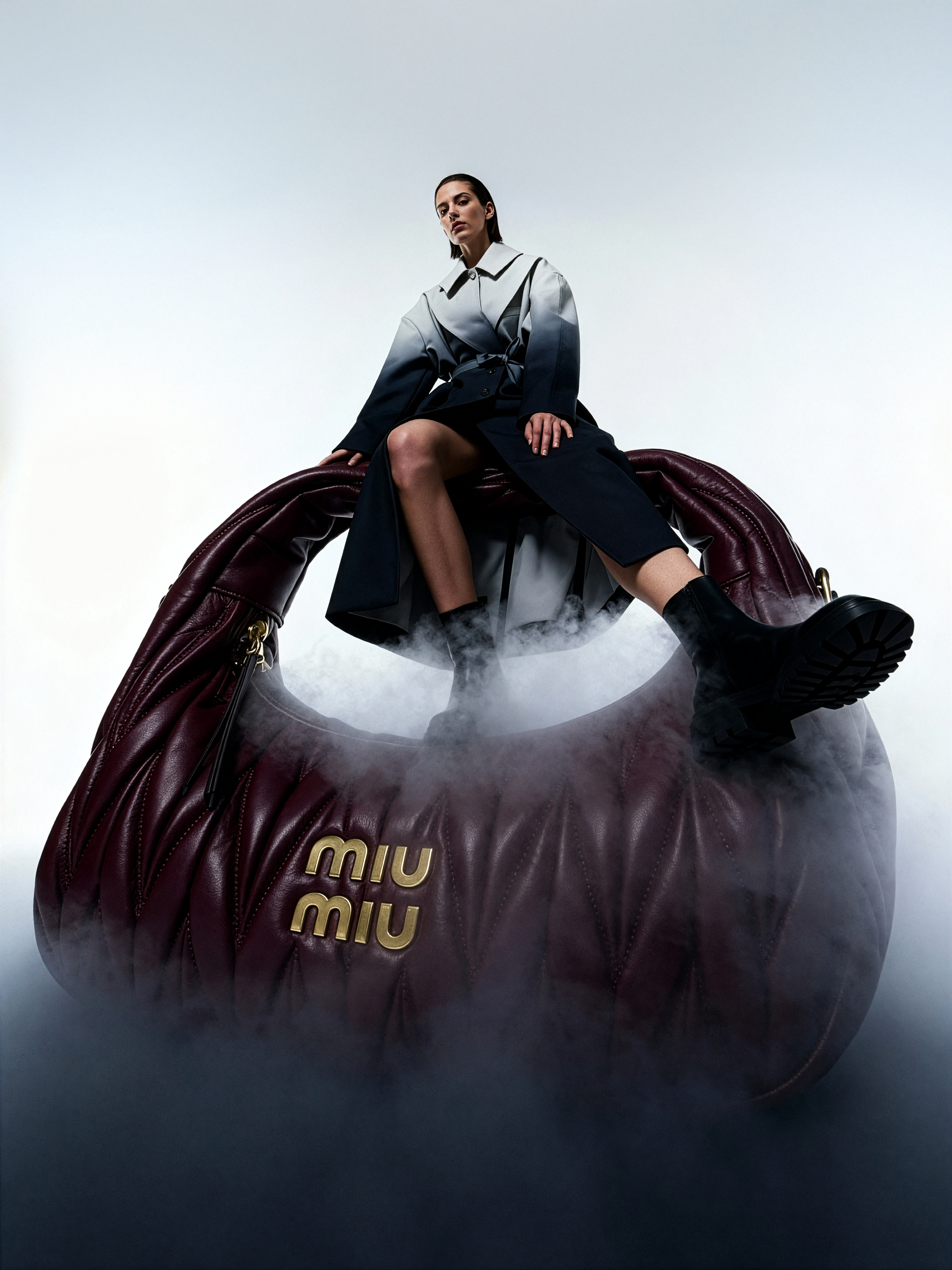 Cinematic full-body wide-angle shot, camera low and slightly tilted upward. European woman in long structured matte trench coat (Yohji Yamamoto aesthetic) stands in dense homogeneous milky fog rising around her calves. She is interacting with a giant Miu Miu Wander Hobo Bag scaled to several times her height, in rich burgundy/oxblood matelassé nappa leather. The bag lies on the fog-covered floor like a futuristic sculpture; she sits on the edge of its handle, one leg extended forward toward camera to elongate perspective, other leg bent, foot planted on the bag’s base. Background is a seamless gradient from bright white at top to smoky charcoal gray at bottom. Lighting: soft diffused front key, subtle rim light from top-left tracing her silhouette and the leather texture. Mood: surreal scale play, fashion architecture, dynamic yet calm. Keywords: Miu Miu Wander bag oversized, giant accessory, dense milky fog, gradient studio, wide-angle distortion, architectural fashion interaction, burgundy leather.